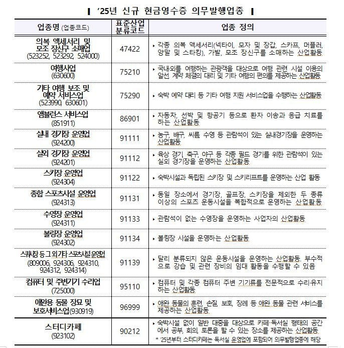 13개 업종은 의복 액세서리 및 모조 장신구 소매업, 컴퓨터 및 주변기기 수리업 등이 포함됐다. 스키장, 수영장, 볼링장도 의무적으로 현금영수증을 발행해야 한다. 의무발행업종은 2023년 112개, 올해 125개로 늘었으면 내년 13개 신규지정으로 138개로 늘어났다.