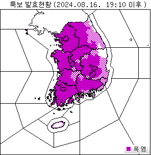 o 폭염경보 : 경기도, 강원도(영월, 정선평지, 횡성, 원주, 철원, 화천, 홍천평지, 춘천, 양구평지, 인제평지), 충청남도(금산, 계룡 제외), 충청북도(보은 제외), 전라남도(여수, 거문도.초도 제외), 전북자치도(고창, 부안, 군산, 김제, 완주, 임실, 순창, 익산, 정읍, 전주, 남원), 경상북도(구미, 영천, 경산, 성주, 칠곡, 김천, 상주, 예천, 안동, 의성), 경상남도(양산, 창원, 김해, 밀양, 의령, 함안, 창녕, 진주, 하동, 산청, 함양, 합천), 서울, 인천(옹진군 제외), 대전, 광주, 대구, 세종