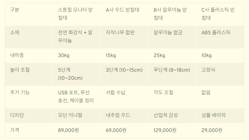 시장에는 다양한 모니터 받침대 제품이 존재하지만, 스톤힐 모니터 받침대는 여러 측면에서 경쟁 제품들과 차별화된 가치를 제공합니다. 주요 경쟁사 제품과의 상세 비교 분석을 통해 스톤힐 제품의 경쟁력을 살펴보겠습니다.