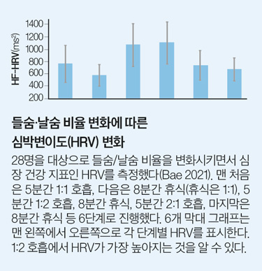 이때, 와 같은 심박수 변동성(HRV) 그래프는 다양한 호흡 비율에 따른 심박수 변동성을 나타냅니다. 특히 1:2의 호흡 비율이 가장 높은 HRV를 기록하는데, 이는 몸의 이완 상태와 관련이 깊습니다.