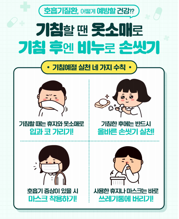 호흡기 질환을 예방하기 위해서는 개인 위생이 매우 중요합니다. 기침이나 재채기를 할 때는 반드시 입과 코를 가리고, 손을 자주 씻는 것이 필요합니다.