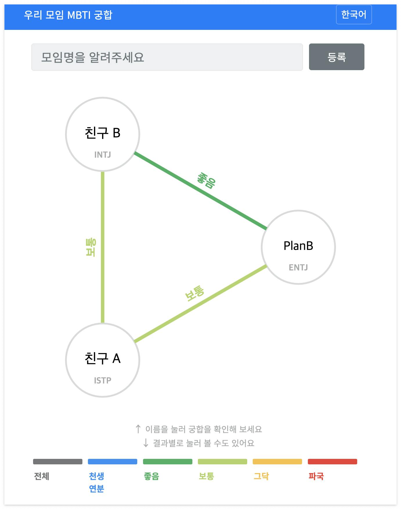 MBTI에 열광하고 있는 요즘, 유행을 타고 있는 서비스가 하나 있다. 우리 모임 MBTI 궁합이라는 웹서비스다. 자신의 MBTI를 입력해 공간(모임)을 만들고 링크를 공유하면, 다른 유저가 타고 들어와 MBTI를 입력해 자리를 채운다. 그러 고 나면 서로의 궁합을 완전 그래프(complete graph) 포맷으로 알아볼 수 있다.