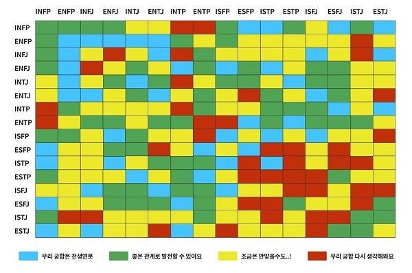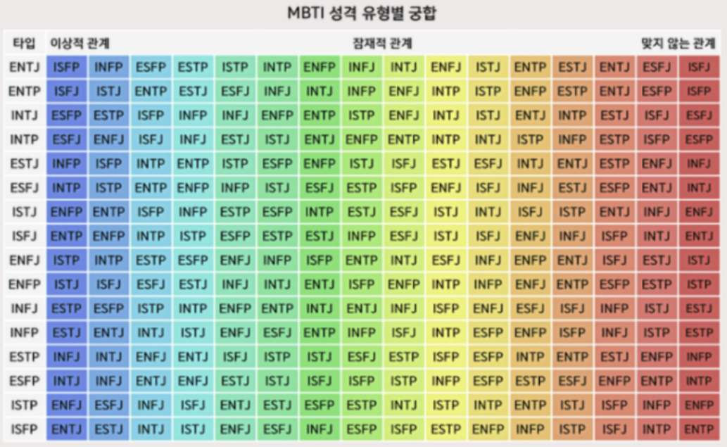 [1] 네이버 블로그 - [mbti별 연애 & mbti별 궁합] 최신 논문으로 이해하는 커플 MBTI... (https://m.blog.naver.com/callbina/222826727610)